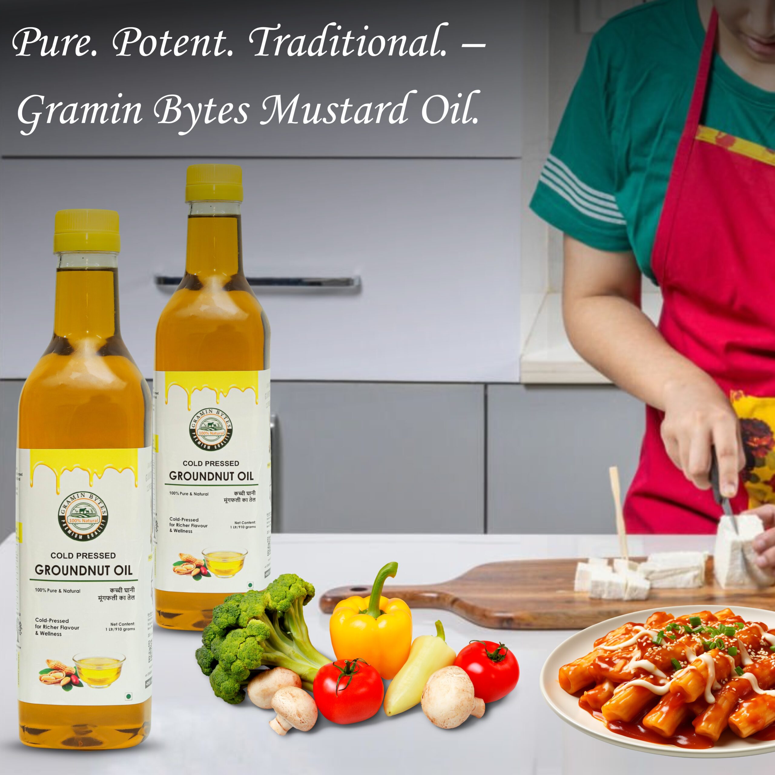 Bring home the purity of tradition with Gramin Bytes® Cold Press Groundnut Oil – 100% Pure and Natural, extracted through a cold-pressed method from carefully selected, sun-dried groundnuts. This natural process retains the oil’s rich nutrients, authentic aroma, and deep, nutty flavor.