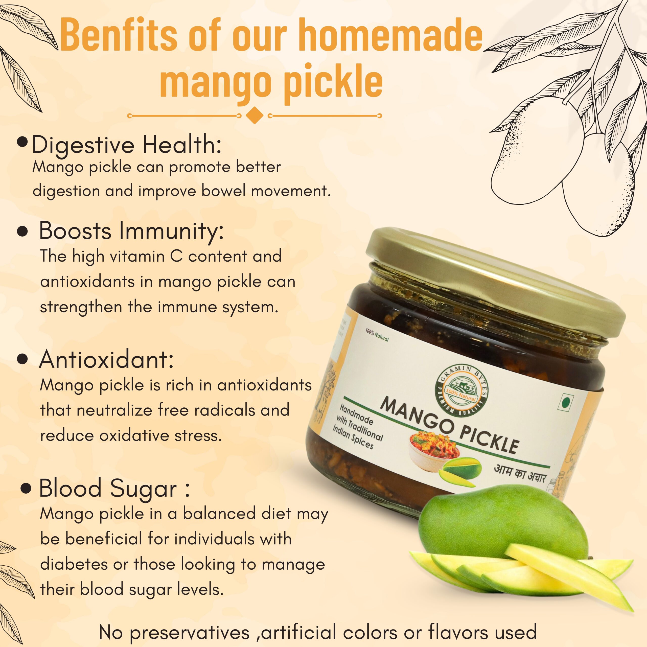 Dive into the rich, spicy flavor of Gramin Bites® Homemade Traditional Mango Pickle (300g)—a handcrafted delicacy by Sharhs Food Products. Using only raw, sun-cured mangoes and Ayurvedic spice blends, this pickle is naturally fermented to perfection, delivering both flavor and digestive wellness.