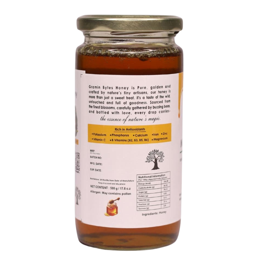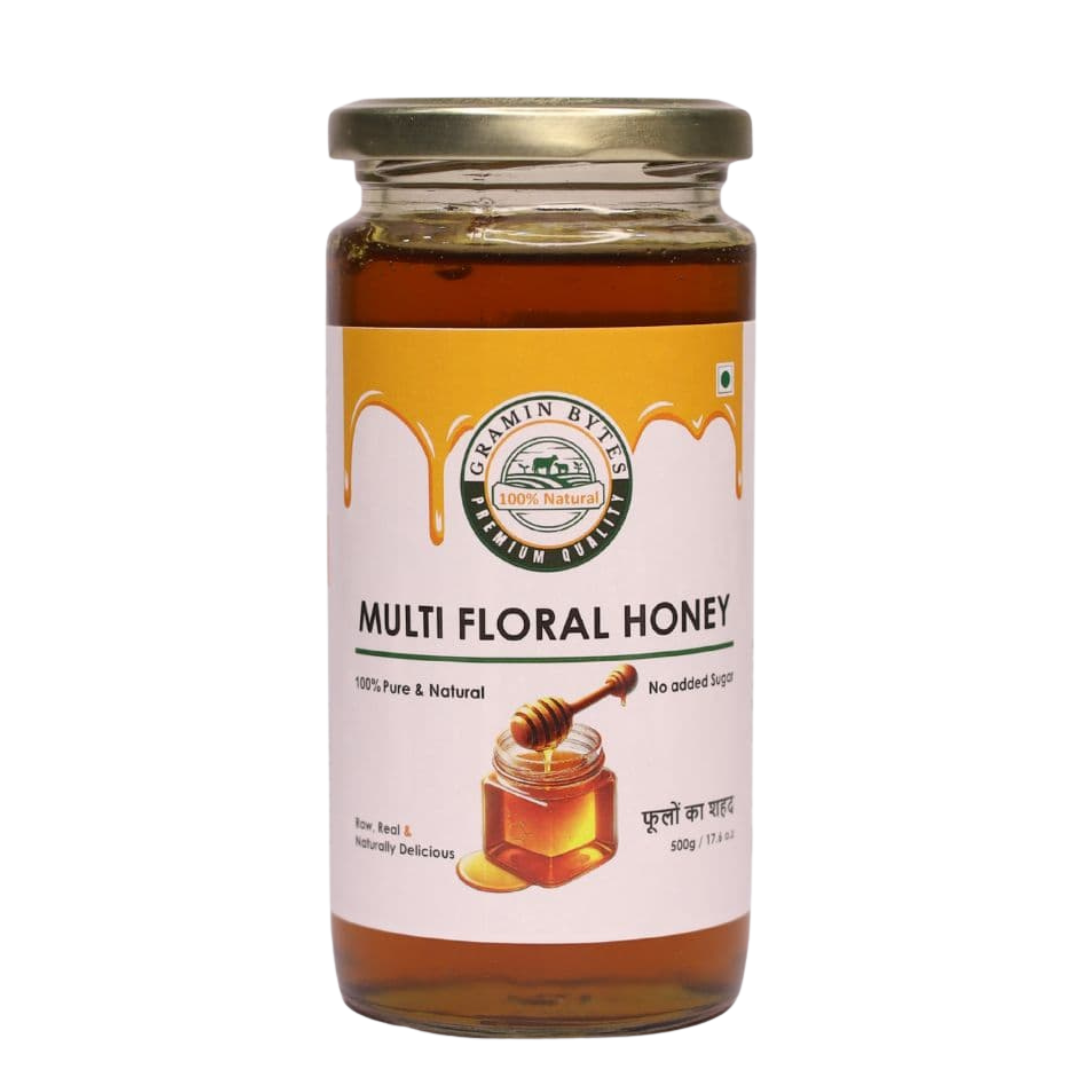 This multi-floral variety offers a unique flavor profile, with subtle floral notes and a smooth texture that make it perfect for daily consumption. Whether stirred into warm water, drizzled on toast, or used in traditional remedies, Gramin Bytes® Honey is both delicious and naturally nourishing.